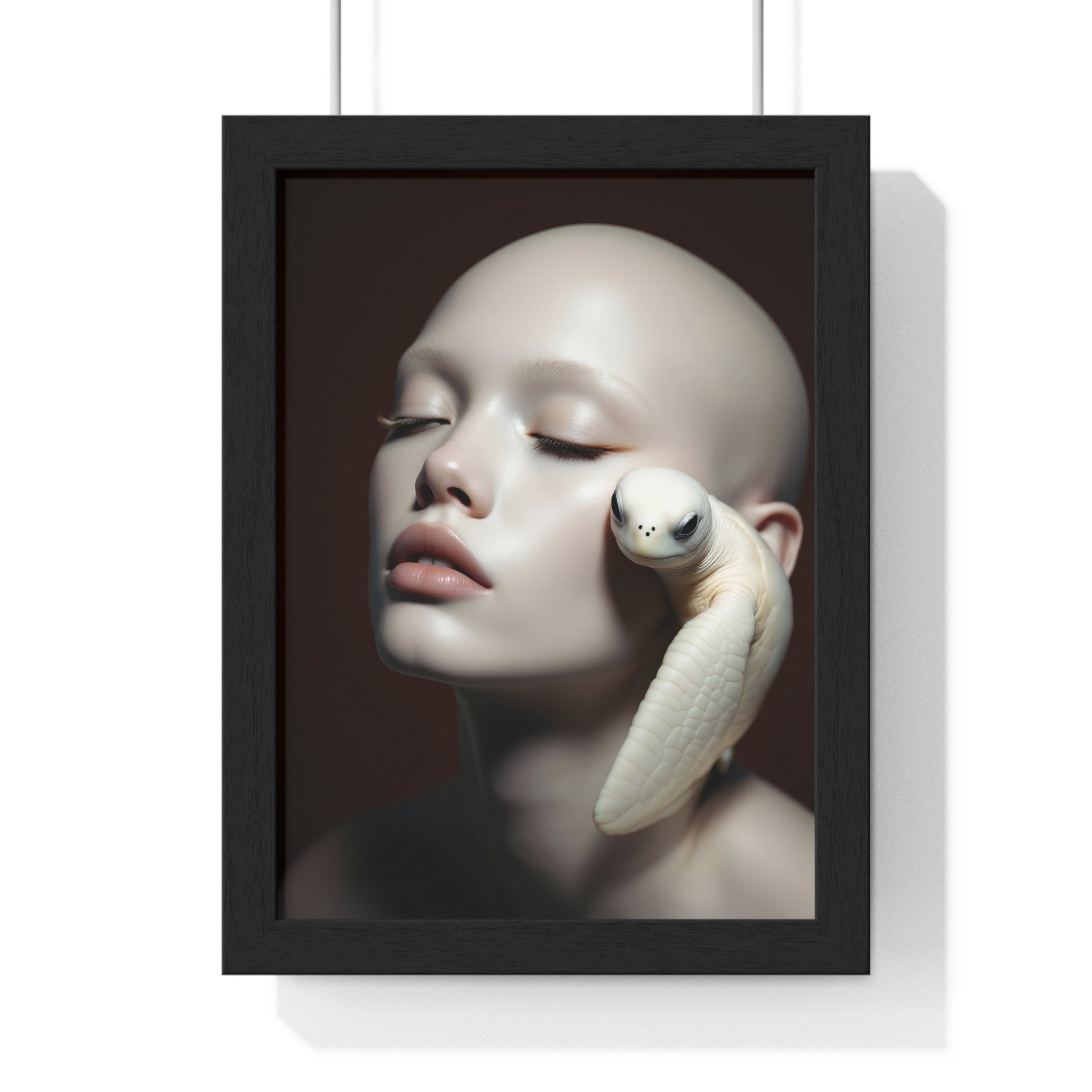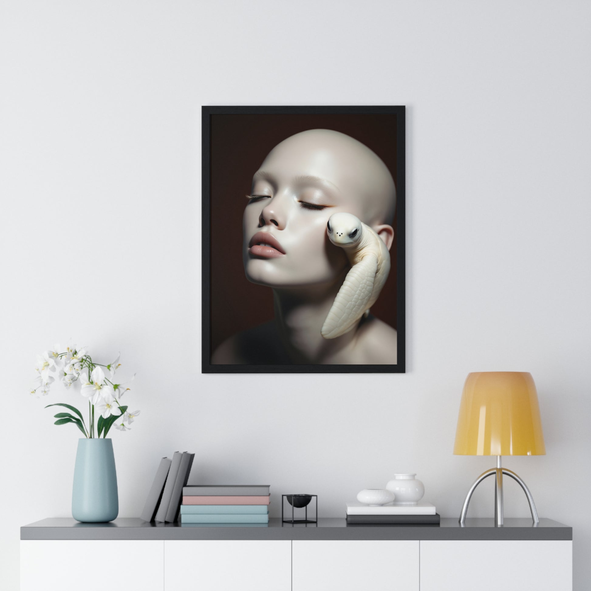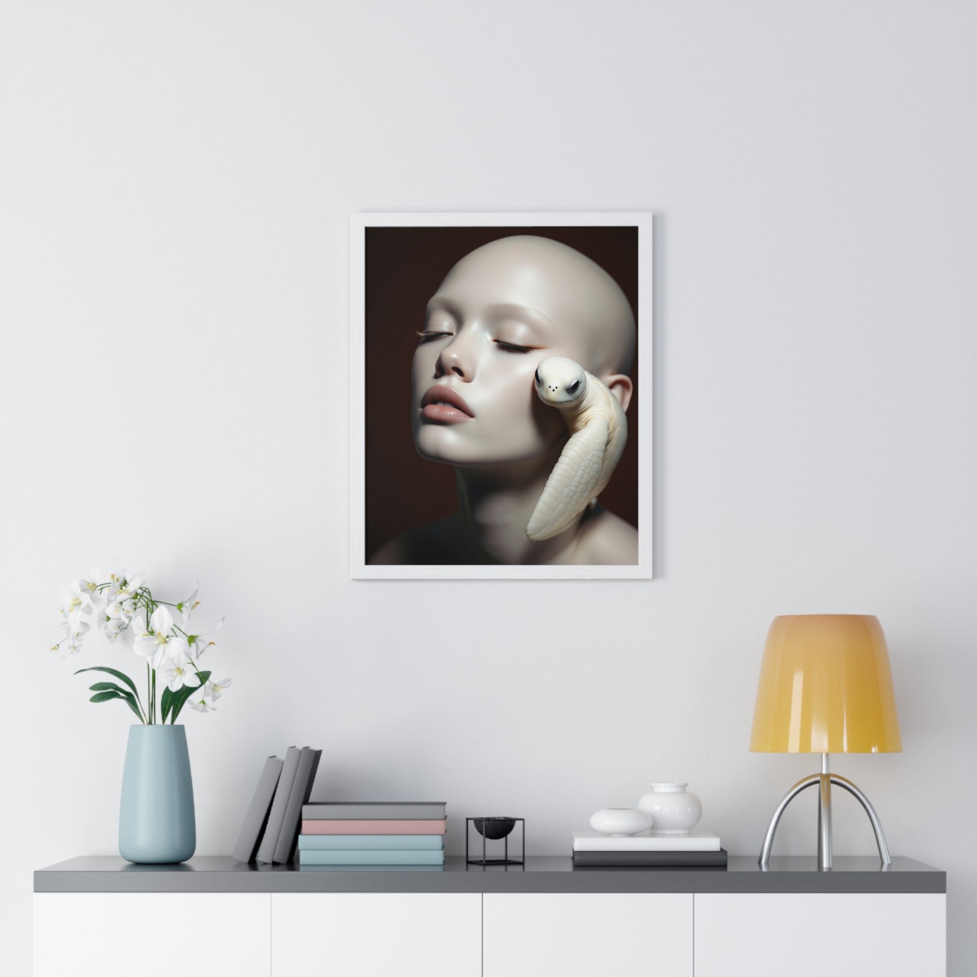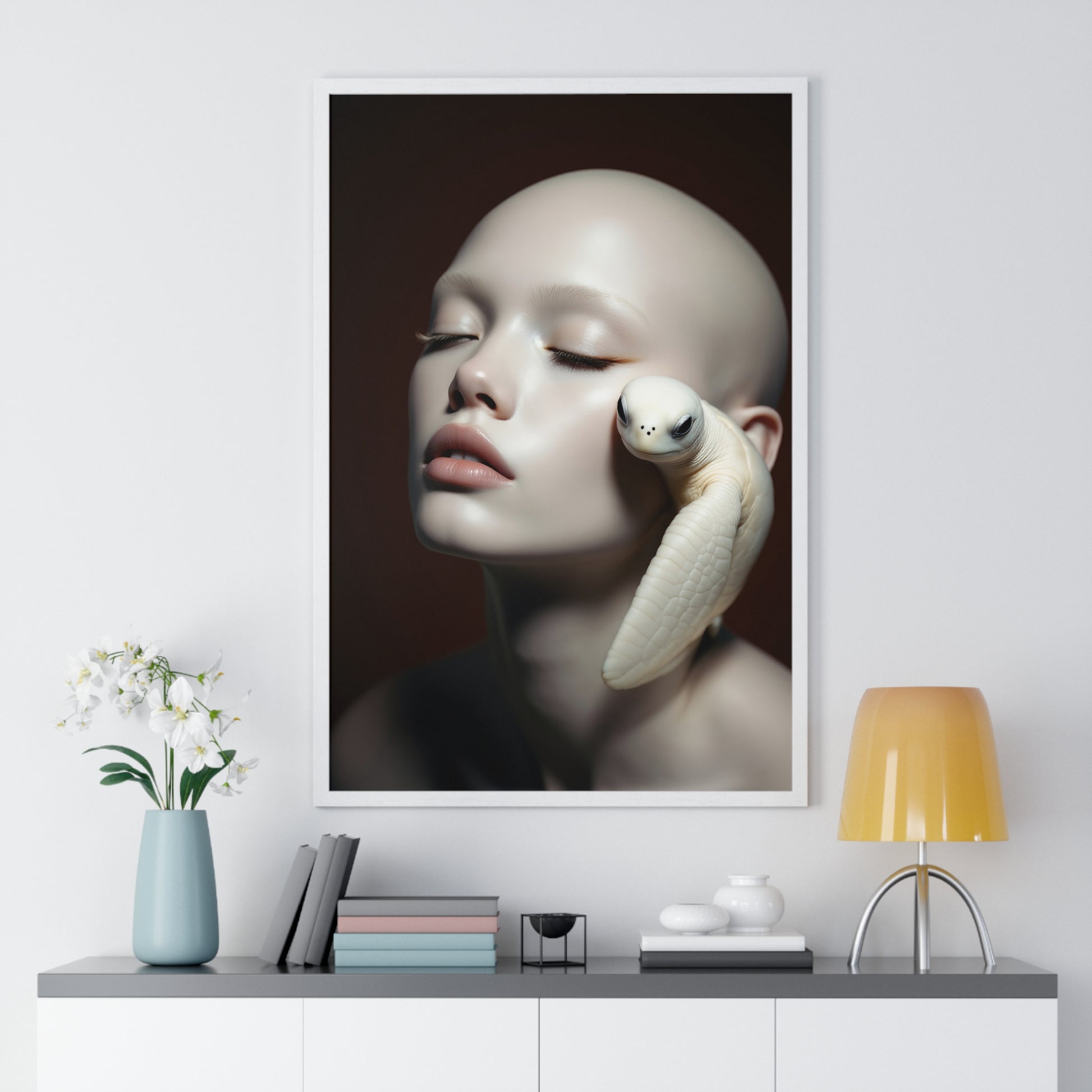 A vertical framed poster featuring a design of White Soul and the Turtle. This unique and artistic poster adds a calm and serene vibe to any room. Perfect for art enthusiasts and individuals looking to add a touch of nature to their living space. Ideal for home decor, gifting on birthdays, anniversaries, and housewarmings.